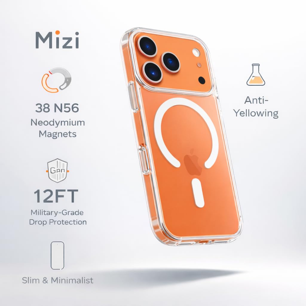 Protect your iPhone 17 Pro with the Mizi Ultra Hybrid Clear Case. Featuring strong Mag Safe magnets, military-grade drop protection, and anti-yellowing crystal-clear design, it keeps your phone safe while showing off its original beauty.